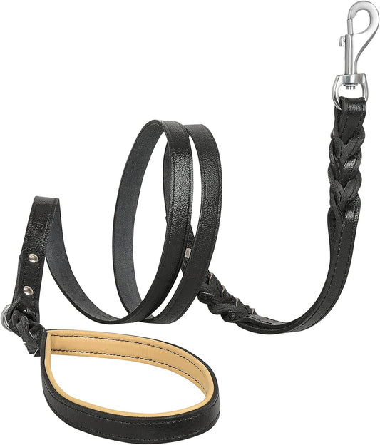 | Heavy Duty Genuine Leather Dog Leash for Small, Medium & Large Breeds | Hand Made, Soft, Padded Handle | with Ring for Poop Bag Holder | Black, Brown | 5' & 6' (5' (5/8" Wide), Black)