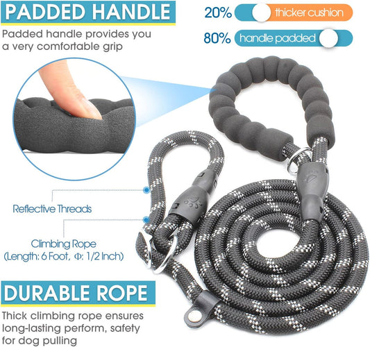 6 Feet Slip Lead Dog Leash Anti-Choking with Upgraded Durable Rope Cover and Comfortable Padded Handle for Large, Medium, Small Dogs Trainning with Poop Bags and Dispenser (Black)